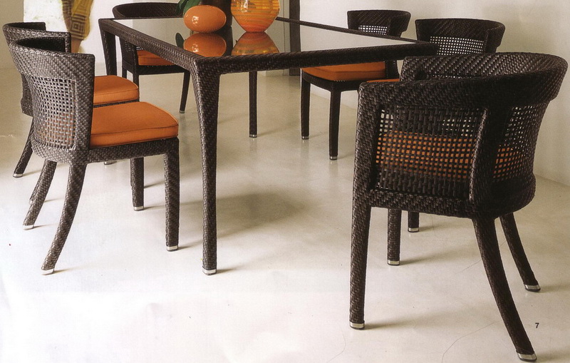 Outdoor Dining Set BNV, with aluminum frame and woven synthetic rattan.