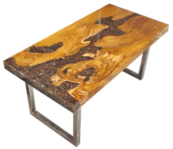 Coffee table, top made out of teak root with brown crackle glass and resin inlay. Legs with square hollow stainless steel pipe.