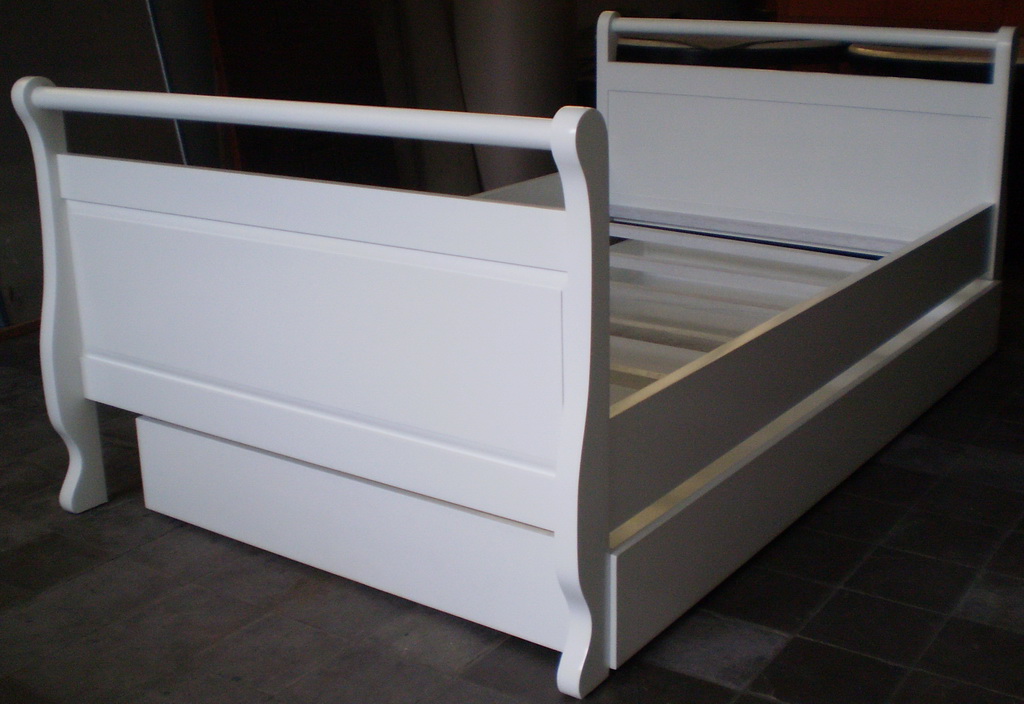 Single mattress bed with nesting mattress bottom. Made out of mahogany wood with white lacquered finish.